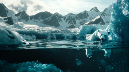 A polar bear glides through clear water, its white fur contrasting with the deep blue sea. Majestic mountains rise in the background under a cloudy sky, evoking a sense of wonder and beauty.