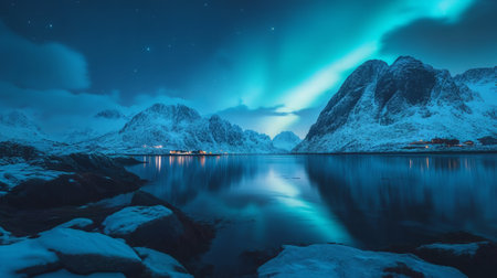Stunning depicting the aurora borealis display over a serene mountain lake at night