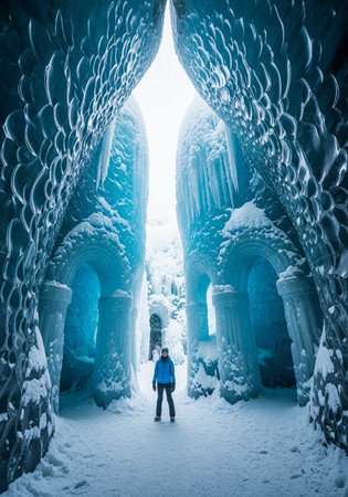 Woman standing in front of a tunnel of ice and snow in winter