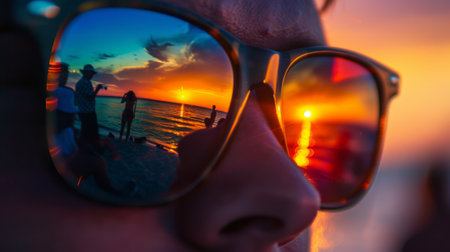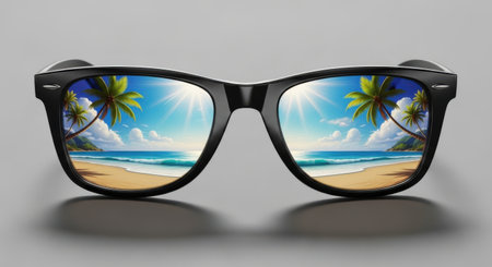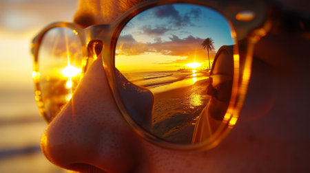 Reflection in the sunglasses shows sea beach. Summer concept. Generative AI illustration