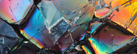 Close-up of glass shards reflecting a faint, moody darklight, creating patterns of color and shadow on a dark background.