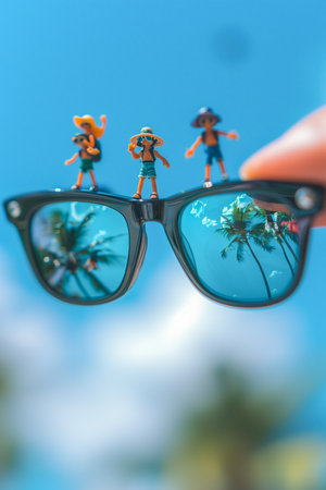 A hand holding a pair of sunglasses with three small figures on top of them. The sunglasses are reflecting the palm trees in the background