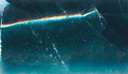 Cracked ice background. Broken glass texture. Teal blue scratched surface with frost dust.