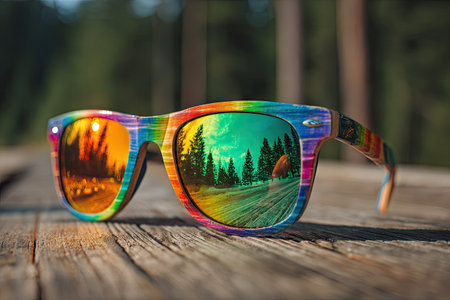 A pair of sunglasses with a vibrant rainbow pattern rests on a weathered wooden surface. The lenses reflect a scenic landscape featuring trees and sunlight. The composition focuses on the eyewear, highlighting its colors and the visual story it presents, suitable for various promotional and artistic projects.
