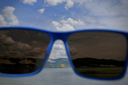 Sunglasses with reflection of the sea and palm trees on a gray background