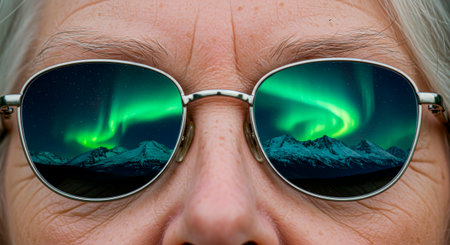 Northern Lights in sunglasses: Aurora Borealis and mountains reflected in the lenses, close-up