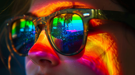 Reflective sunglasses show a vibrant rainbow flag, prideful