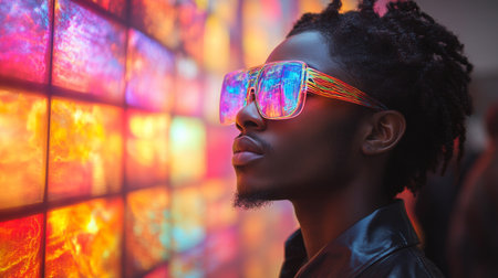Sunglasses reflecting a colorful kaleidoscope pattern on a vibrant background