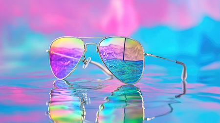 A pair of stylish sunglasses rests on a colorful water surface, reflecting vibrant hues and creating an abstract, dreamy background that enhances summer vibes.