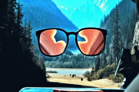 reflection of the sunset in the backpacker's sunglasses generative ai