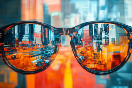 A close-up shot of stylish sunglasses featuring vibrant, multicoloured reflective lenses. The reflection of an urban scene can be seen in the lenses, adding to the dynamic and eye-catching appeal. The smooth gradient of purple, blue, and yellow hues in the glasses contrasts beautifully with the blurred, colourful background. This image encapsulates modern eyewear design with a focus on artistic and functional aesthetics.