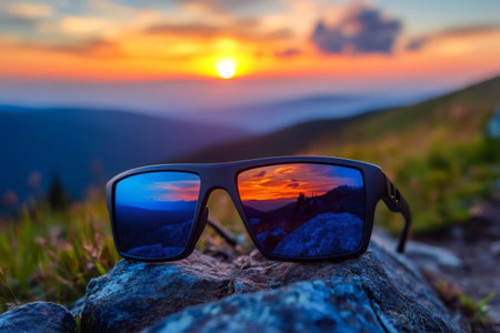 Stylish sunglasses reflecting a breathtaking sunset view over a mountain range during golden hour