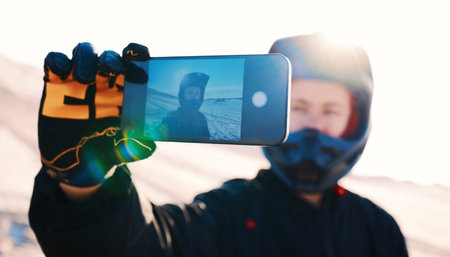 Phone selfie, biker and man in desert adventure, nature or sport outdoor. Rider, helmet and person take picture on smartphone to travel on social media, transportation and off road journey in Namibia