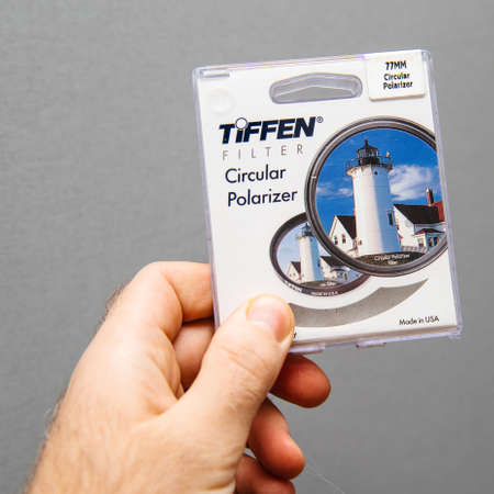 Paris, France - Jan 3, 2018: Man hand holding against gray background professional Tiffen Circular Polarizer filter for 77mm diameter camera lens