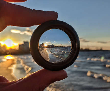 View of the sea surf through a photographic lens on a sandy beach on a sunny day