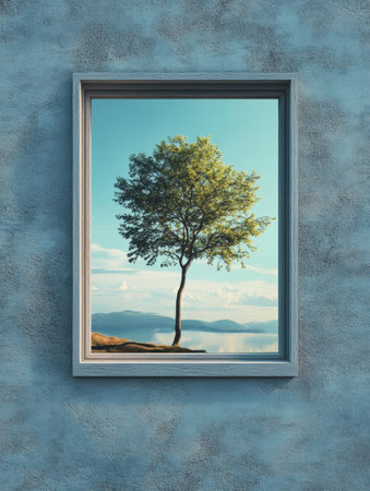 A peaceful window displays a vibrant tree accompanied by a calm natural landscape, creating a sense of tranquility and connection with nature.