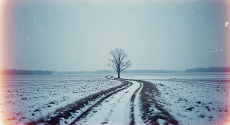 A solitary tree in a snowy field with a winding dirt path