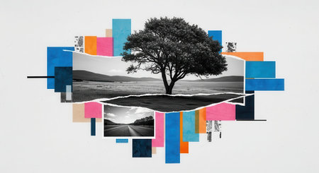 Creative collage of tree and landscape with colorful geometric elements.