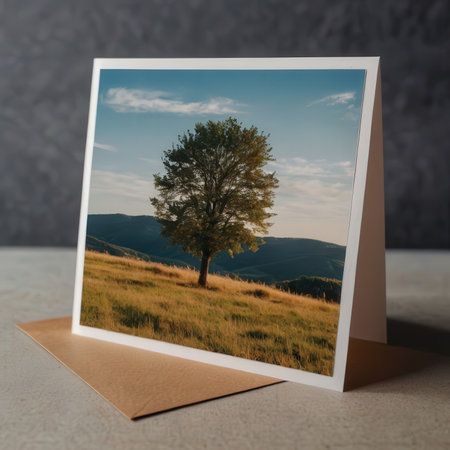A framed landscape photographs depict a lone tree against a vast, arid field with distant mountains under a cloudy sky.
