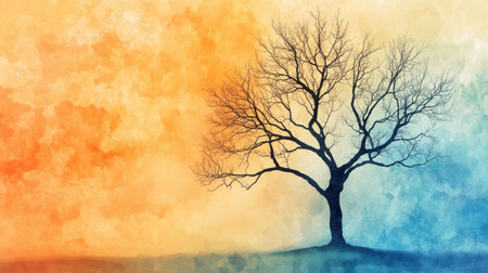 This artwork showcases a minimalist silhouette of a single tree with bare branches against a backdrop of warm amber and cool blue watercolor gradients.