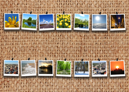 Colorful polaroid photos are artistically arranged along a string using clothespins, set against a lush, green background.