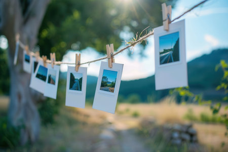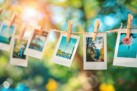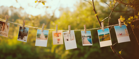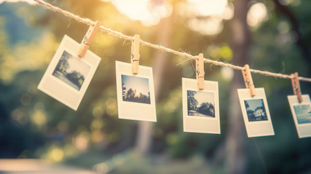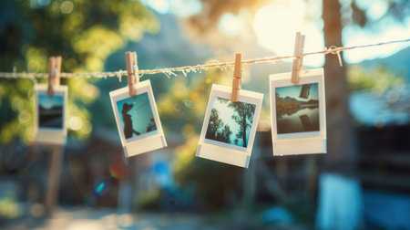A collection of Polaroid pictures is hanging on a string with clothespins, illuminated by soft sunlight in a serene outdoor setting.