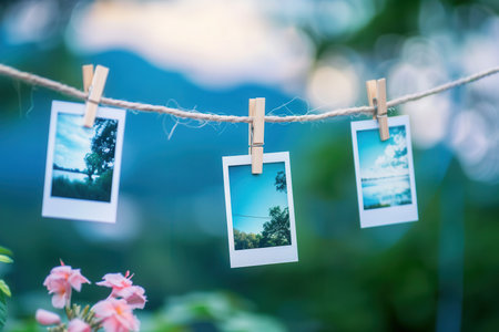 Colorful polaroid snapshots are hung on a string with clothespins, creating a charming display in a serene setting with a soft blue backdrop.