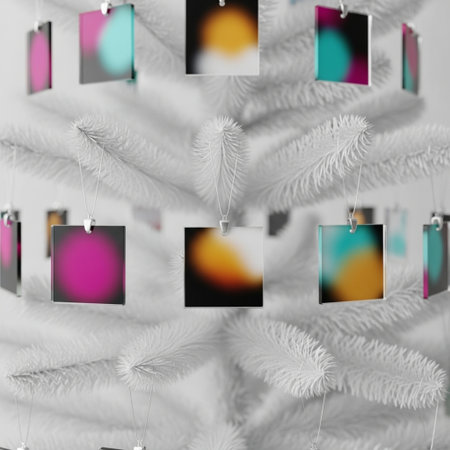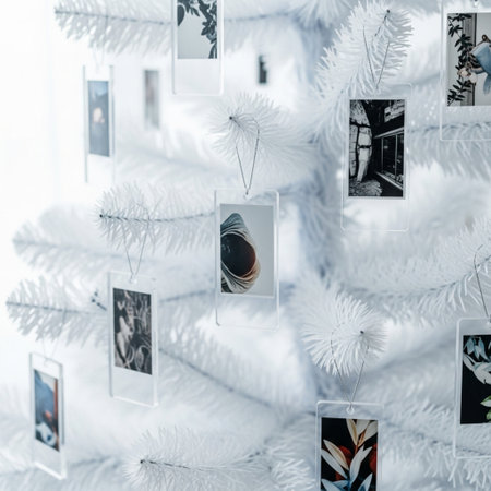 A cluster of various photographs adorning the branches of a tree, creating a unique display, Polaroids hanging from a tree depicting fun birthday memories, AI Generated