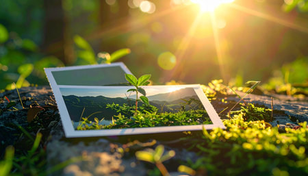 In the heart of a sun-drenched forest, a tiny green sprout emerges through a photograph of a distant landscape. This conceptual image symbolizes new beginnings, hope, and the powerful, enduring cycle of nature breaking through past memories to create a new future.