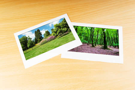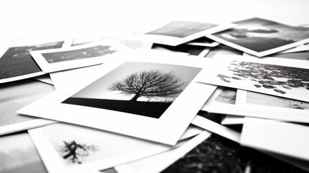 A wooden table with multiple photographs arranged on its surface. AI-generated.