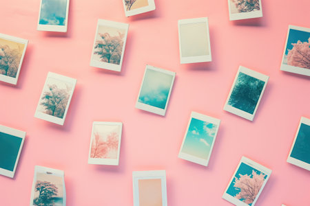 A photo featuring polaroid photos of trees, captured against a pink background, Polaroids arranged in a pattern over a light pastel background, AI Generated