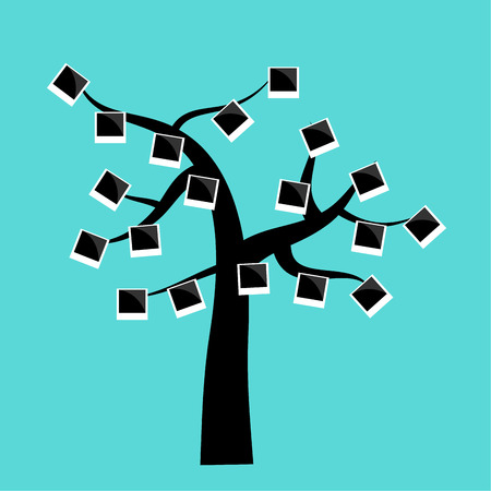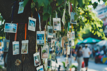 A tree showcasing pictures hanging from its branches, creating a unique and personal display, Polaroids hanging from a tree depicting fun birthday memories, AI Generated