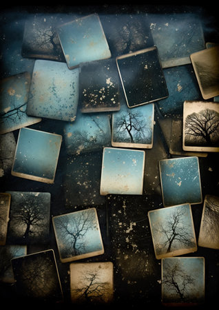 A weathered hand holds an old photograph featuring a decaying landscape with stark trees and dramatic clouds, evoking feelings of nostalgia and memory.