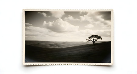 A single tree in nature black-and-white photograph with faded edges, placed on clean white background