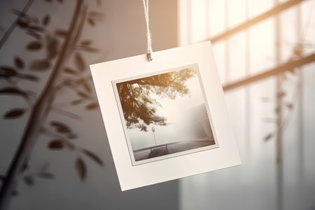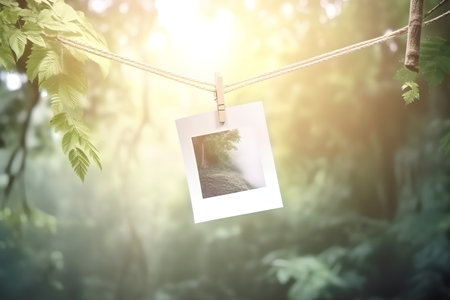 Polaroid memories hanging gracefully on a string, showcasing natures beauty against a blurred forest background.