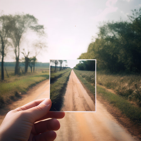 Man hand holding instant photo of family picnic. Sepia snapshot for memory remembrance. Family trauma and solitude concept.