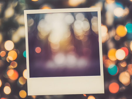 Colorful Polaroid photos hang on clothespins along a string, softly lit by fairy lights, creating a warm and inviting atmosphere outdoors.