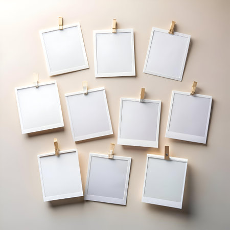 A collection of 8 blank instant photo frames on a soft beige background. perfect for adding your own memories and creating a personalized look.