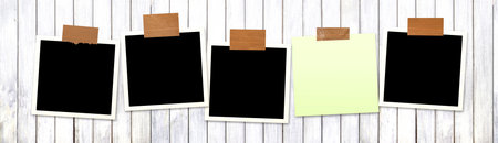 Four frame photos with adhesive tape stripes at wooden wall. Horizontal banner featuring a pictures album grid for scrapbooking. Vintage style mood board layout. Copy space for your text and photo