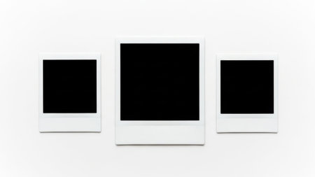 This image features three Polaroid photographs arranged in a row against a plain white background. Each photograph has a white border and a black center, indicating that the images are blank or unexposed. The simplicity of the background and the uniformity of the Polaroid frames create a minimalist aesthetic.