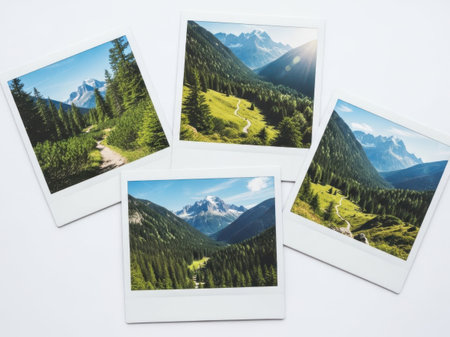 A collection of four Polaroid photos showcasing breathtaking mountainous landscapes with lush greenery and clear skies.