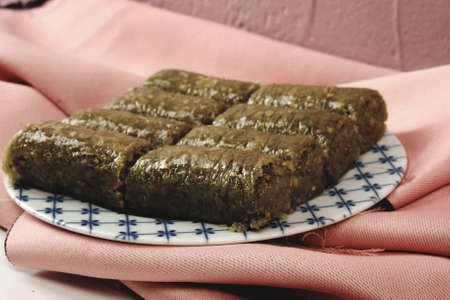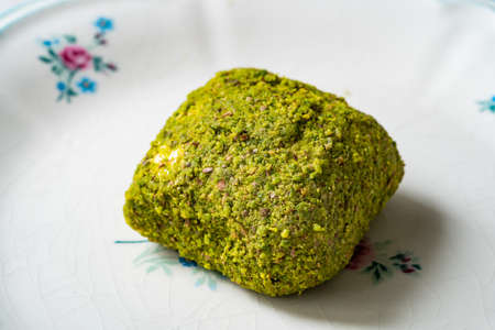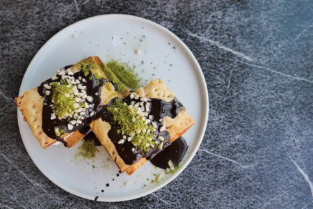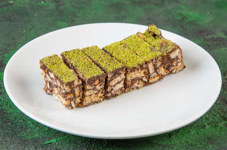 Turkish specific dessert muska pestil with pistachio powder and hazelnut chocolate cream . amulet. ready to eat.