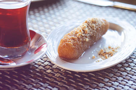 Turkish dessert from Erzurum dolma kadayifi and turkish tea. Close up.
