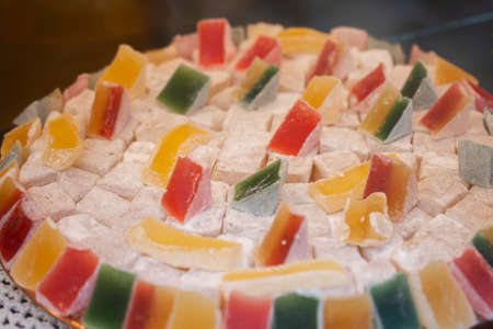 Assorted Turkish delights Rahat lokum. Colorful cubes of Turkish delights. Ramadan bayrami (eid al fitr) and Kurban bayrami (eid al adha) background photo.
