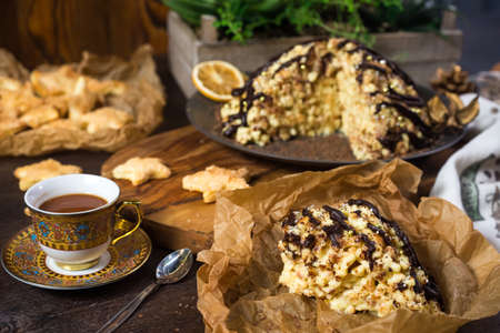 Anthill cake sprinkled with chocolate. Soviet food. sweet pastry. Homemade baked village food.