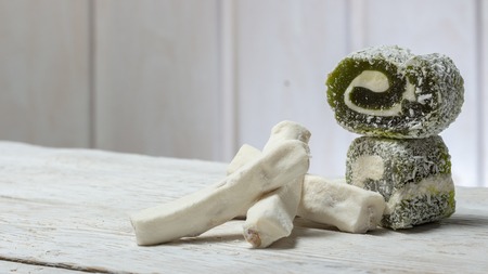 Turkish delight on white rustic background. Turkish deligh set. Assorted traditional turkish delight on oriental background.