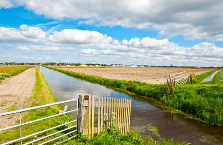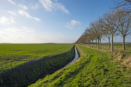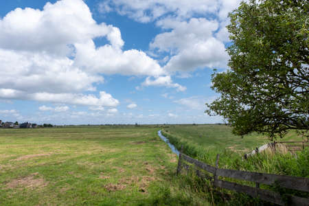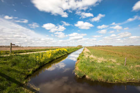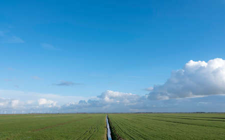 meadow landscape with canal and blue sky with clouds in the netherlands