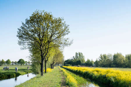 yellow rapeseed flowers under tree and spotted cows in green spring meadow in the centre of Holland near Leerdam with blue sky