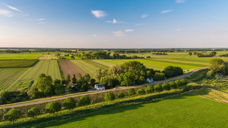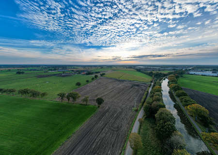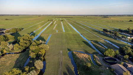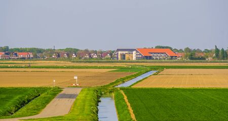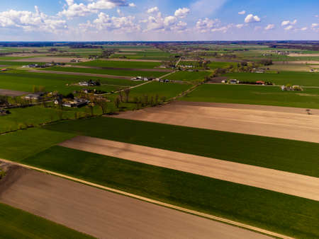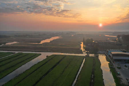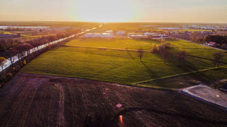 Dutch polder landscape early in the morning on a sunny day in the spring season. Aerial view