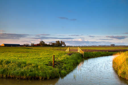 typical dutch farmland with canals at sunrise, Groningen, Netherlands